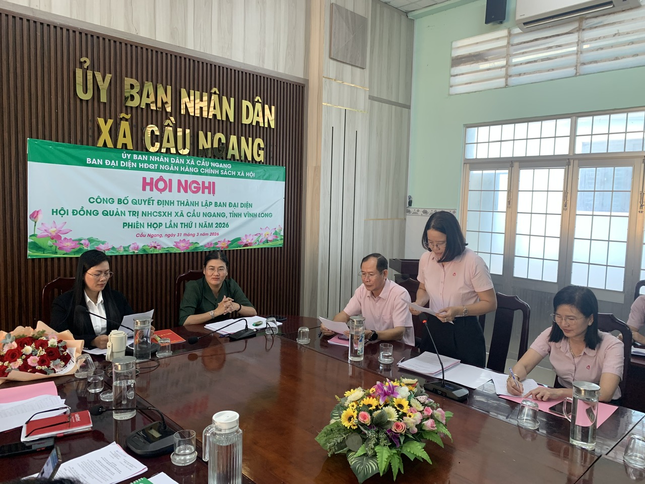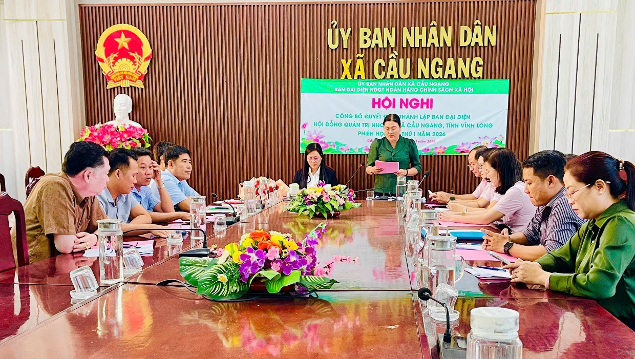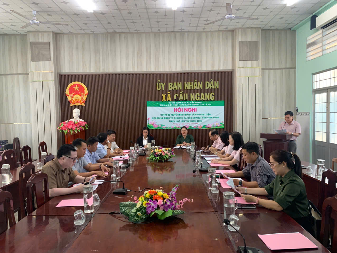Tại hội nghị, đại diện UBND xã đã công bố quyết định thành lập Ban đại diện Hội đồng quản trị NHCSXH xã Cầu Ngang gồm 04 thành viên. Đồng chí Võ Thị Thúy Hằng, Phó Bí thư Đảng ủy - Chủ tịch UBND xã làm Trưởng ban. Các thành viên gồm có đồng chí Huỳnh Minh Toàn, UVBTVĐU - Chủ tịch Ủy ban MTTQ Việt Nam xã; đồng chí Nguyễn Huy Cường, ĐUV - Trưởng phòng Kinh tế xã; đồng chí Lâm Thị Hồng Hạnh, Phó Giám đốc Phòng Giao dịch Ngân hàng CSXH Cầu Ngang - Thành viên chuyên trách..